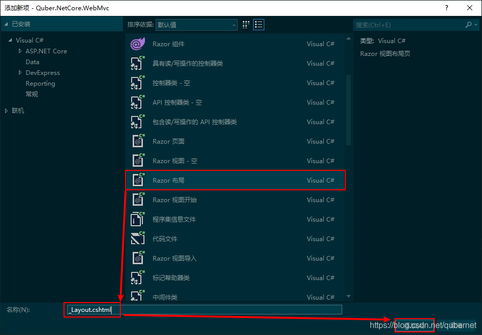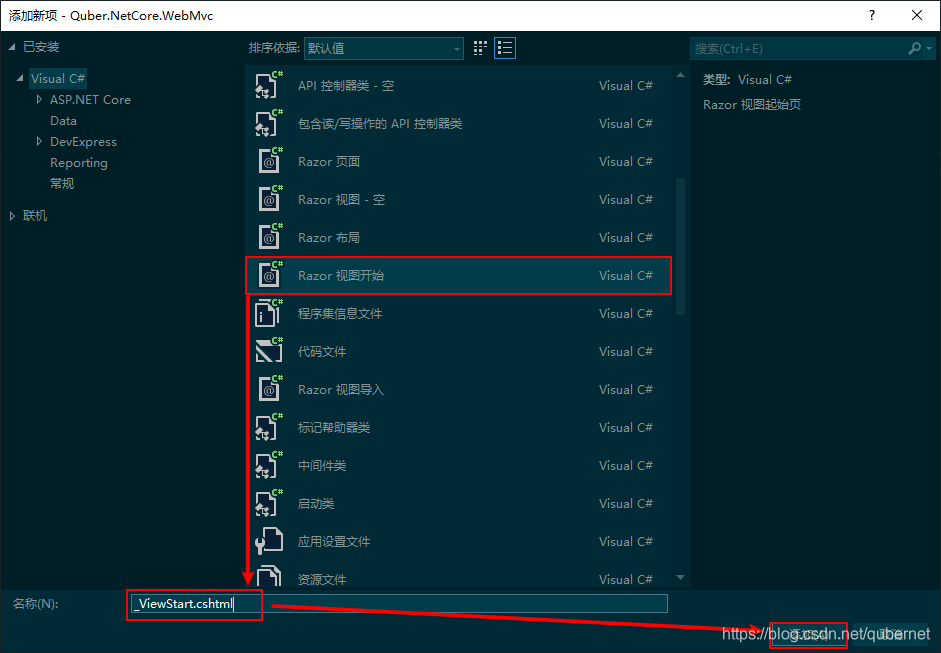 在Views文件夹中创建_ViewStart.cshtml视图文件,该文件必须放在Views文件夹内,这是微软规定好的。_ViewStart.cshtml是MVC框架中View的启动文件,这是MVC框架中必需要有的,可以在这里指定母版页_Layout.cshtml的路径。