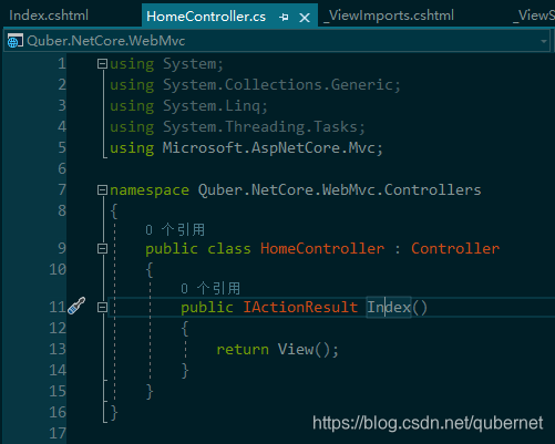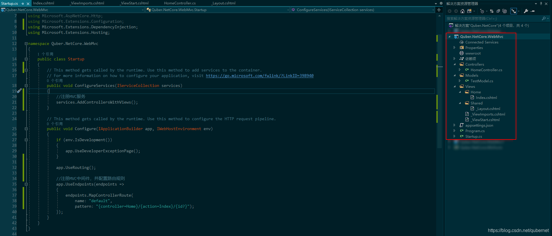 2.6. 运行项目public class Startup { // This method gets called by the runtime. Use this method to add services to the container. // For more information on how to configure your application, visit https://go.microsoft.com/fwlink/?LinkID=398940 public void ConfigureServices(IServiceCollection services) { //注册MVC服务 services.AddControllersWithViews(); } // This method gets called by the runtime. Use this method to configure the HTTP request pipeline. public void Configure(IApplicationBuilder app, IWebHostEnvironment env) { if (env.IsDevelopment()) { app.UseDeveloperExceptionPage(); } app.UseRouting(); //注册MVC中间件,并配置路由规则 app.UseEndpoints(endpoints => { endpoints.MapControllerRoute( name: "default", pattern: "{controller=Home}/{action=Index}/{id?}"); }); } }