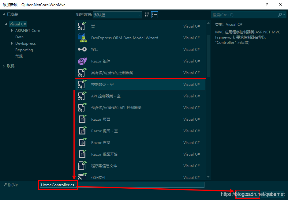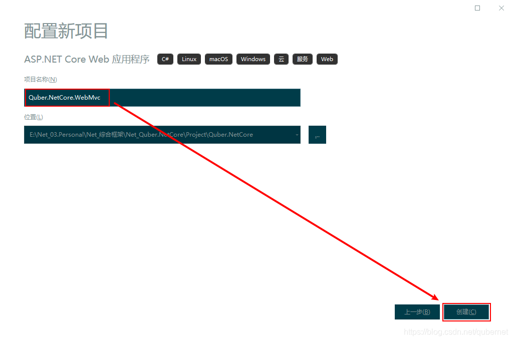 创建WebMVC项目,在模板输入框中输入关键字Core,然后在下方找到ASP.NET Core Web应用程序并选中,然后点击下一步,如下图所示: