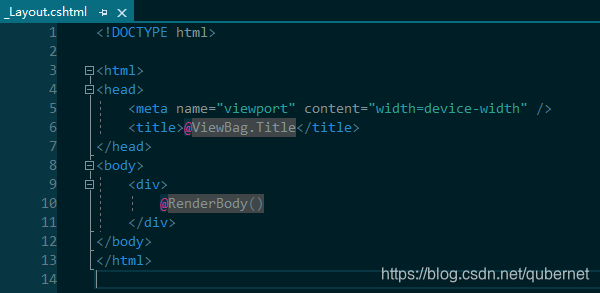 在Views文件夹的Shared文件夹中创建_Layout.cshtml视图文件,该文件将会作为其他视图文件的母版页进行使用,其中的RenderBody会渲染加载其他子Views的内容。