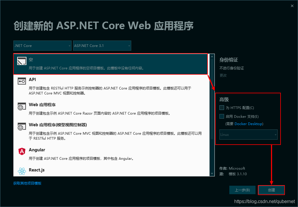 接下来选择“空”选项,将“为HTTPS配置”勾选取消,点击创建,如下图所示: