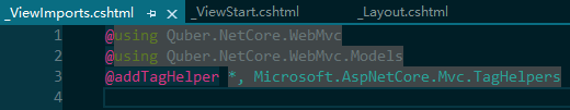在Views文件夹中创建_ViewImports.cshtml视图文件,该视图文件的主要目的是将我们需要用到的命名空间引入,免得在每个视图文件进行单独的引用,然后将系统的命名空间写入该文件。