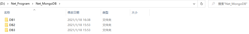 3.1、我们在D:\Net_Program\Net_MongoDB下创建DB1(主节点)、DB2(副节点)和DB3(仲裁节点)文件夹分别用来安装MongoDB数据库,如下图所示: