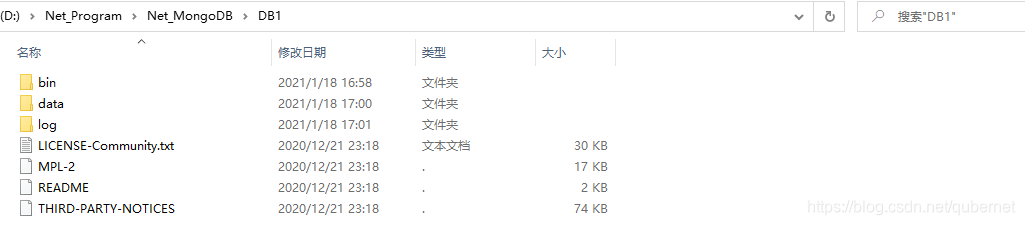 3.2、我们将下载下来的压缩包mongodb-windows-x86_64-4.4.3.zip解压到DB1(主节点)文件夹内,如下图所示: