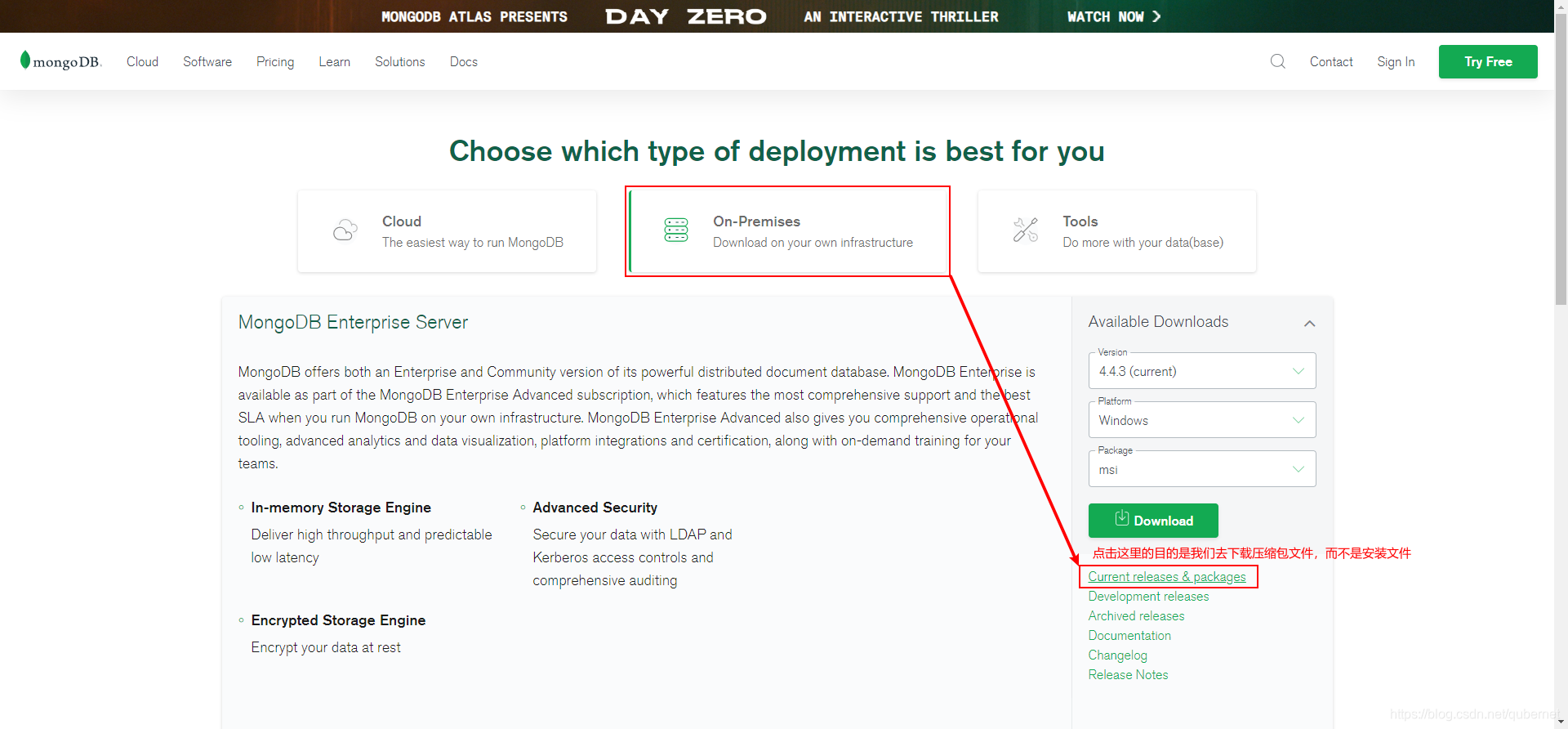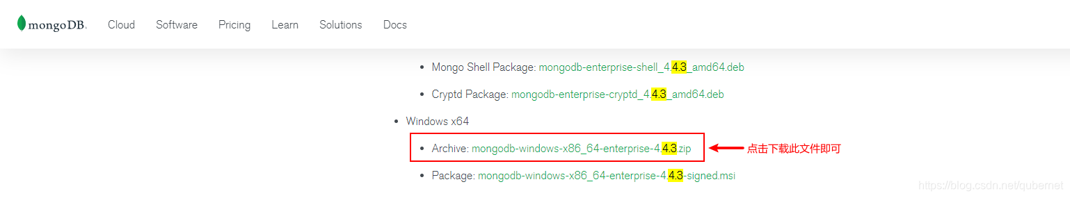 这里我们下载Windows版本的4.4.3版本,压缩包地址为:https://downloads.mongodb.com/windows/mongodb-windows-x86_64-enterprise-4.4.3.zip