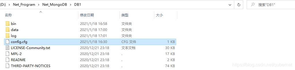 在DB1(主节点)文件夹内创建config.cfg配置文件(文件的后缀名不限制),配置文件的具体内容如下所示(DB1(主节点)中配置MongoDB的端口号为1666,根据自己的实际情况修改即可,更多配置参见官网:https://docs.mongodb.com/manual/reference/configuration-options/):