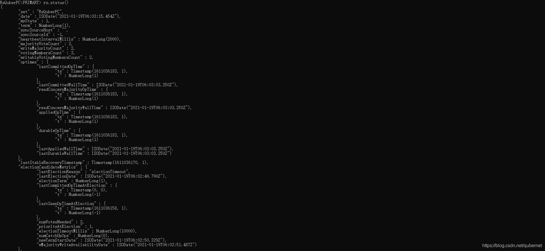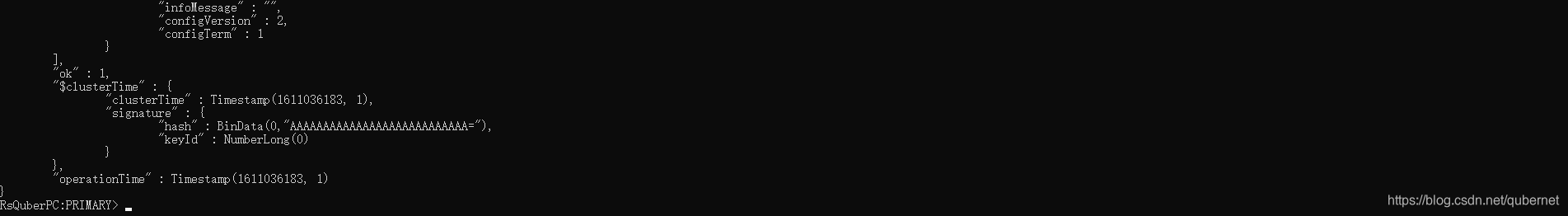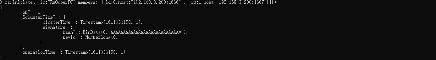 6.2、然后输入如下命令初始化集群(命令中的RsQuberPC为配置文件config.cfg中的集群名称):rs.initiate({_id:"RsQuberPC",members:[{_id:0,host:"192.168.2.200:1666"},{_id:1,host:"192.168.2.200:1667"}]})