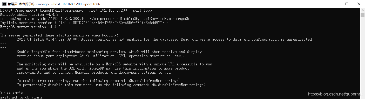 6.1、任意连接上一台MongoDB,比如这里我们使用DB1(主节点),以管理员身份运行CMD并定位到bin文件夹,然后输入如下命令:mongo --host 192.168.2.200 --port 1666use admin