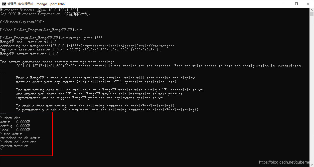 7.3、输入如下命令分别来测试“查看数据库”、“使用(切换、指定)数据库”和“查看指定数据库下的集合”:show dbs #查看数据库 use admin #使用(切换、指定)数据库 show collections #查看指定数据库下的集合