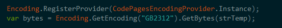 然后在var bytes = Encoding.GetEncoding("GB2312").GetBytes(strTemp);之前注册对编码进行注册:Encoding.RegisterProvider(CodePagesEncodingProvider.Instance);