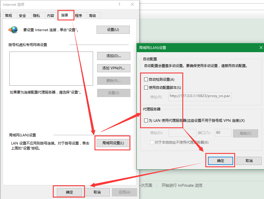 1.打开Internet选项→连接→局域网设置,将所有的勾选都去掉,然后点击确定。如下所示: