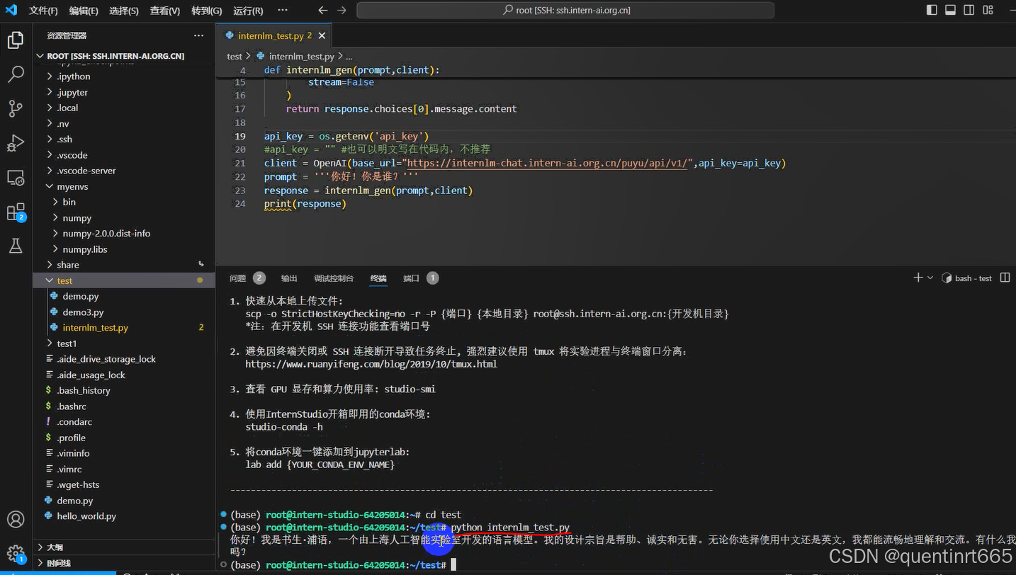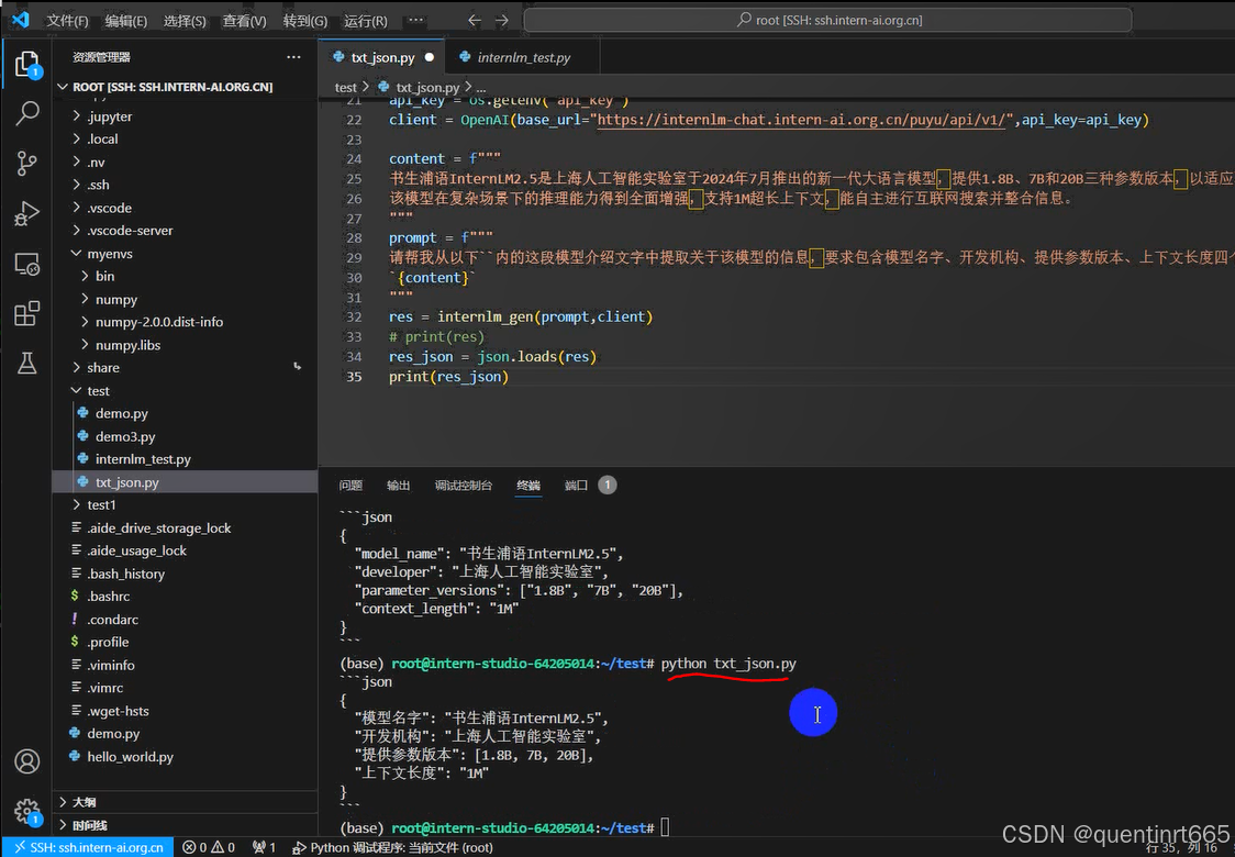 3.建立internlm_test.py文件,将调用程序粘贴并在终端开始执行,结果如下图,调用成功。