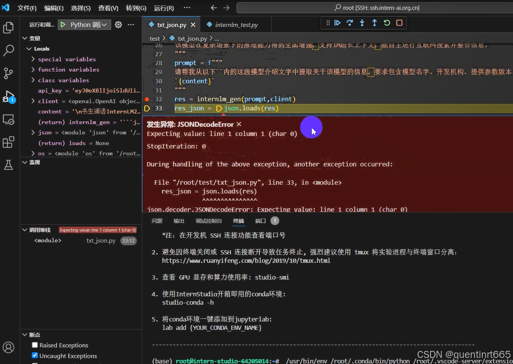 4.建立test_json.py文件,将调用程序粘贴并执行debug,显示报错信息。