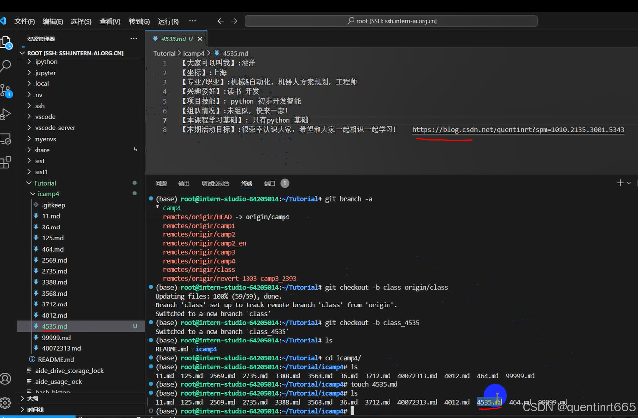 这里起初我是网页登录书生开发机进入终端的,大家可以直接在vscode上利用SSH连接开发机操作。后面我又回到了vscode上操作。