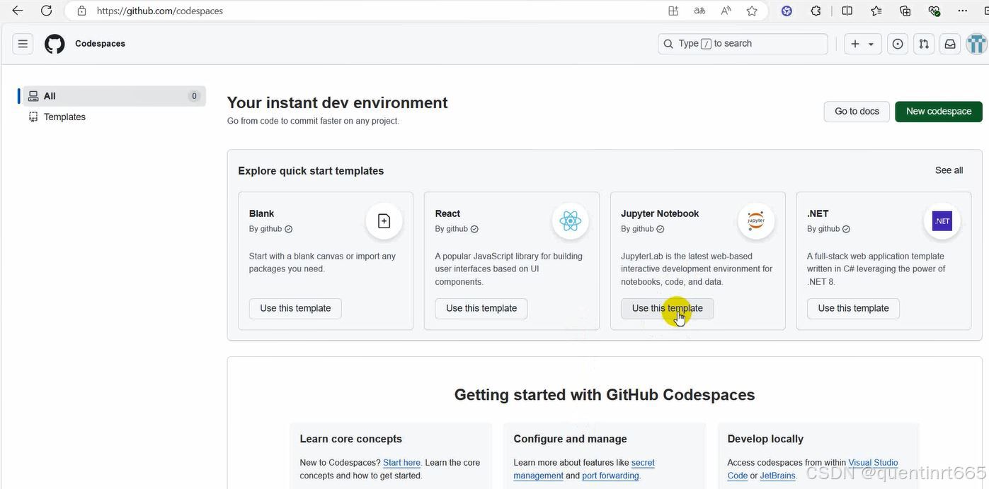 1.打开github页面,进入codespace,选择jupyter Notebook 界面。Sign in to GitHub · GitHubGitHub is where people build software. More than 100 million people use GitHub to discover, fork, and contribute to over 420 million projects.