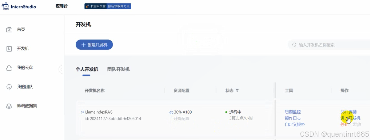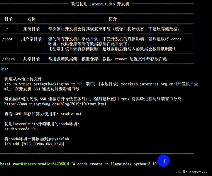 点击进入开发机后,创建新的conda环境,命名为 llamaindex,在命令行模式下运行: