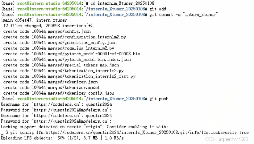 执行git命令,上传模型。注意需要输入魔乐社区的账号和你创建的魔乐社区的api_key