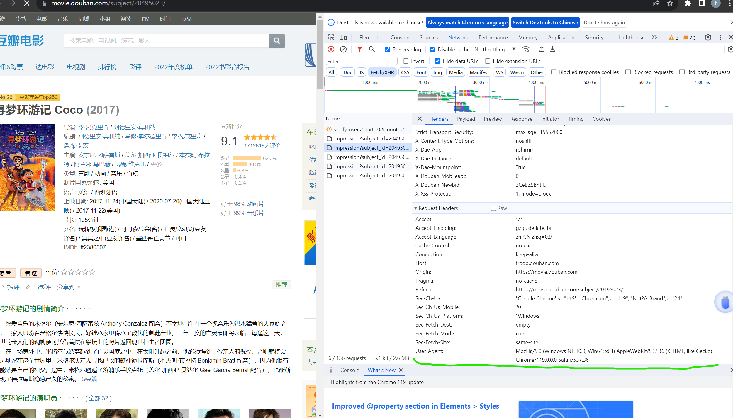 修改请求头,因为某瓣有反爬机制,不修改的,该请求头默认为python的标识,修改的请求头可在f12的netword数据中获取