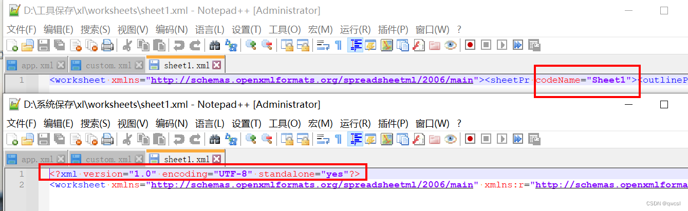 7、xl/worksheets下工作表xml文件,python保存的文件头部格式内容少,且整个xml文件组织结构差异较大