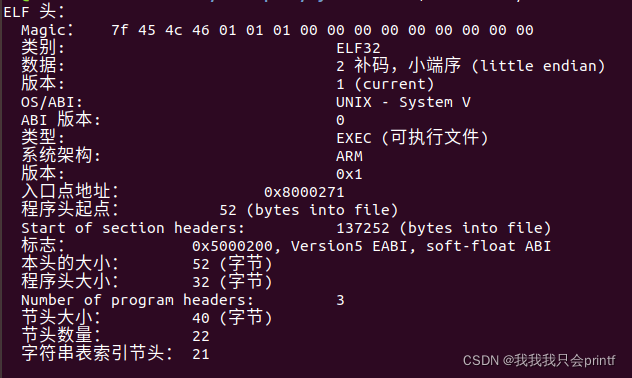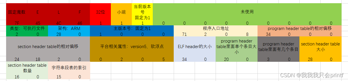 很明显,前四个字节是固定的,分别是0x7F和E、L、F的ASCII值。