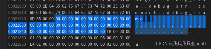 首先我们如果想知道名称,必须要先找到包含段名的字符串表,这也是为什么ELF文件头里面要把包含段名的字符串表的索引单独列出来的原因,由上一节我们知道段名字符串表索引是 21 ,注意索引是从 0 开始的。所以字符串表在段表里面的起始地址应该是 0x00021824 + 21 * 40 = 0x21B6C ,查看该地址处数据: