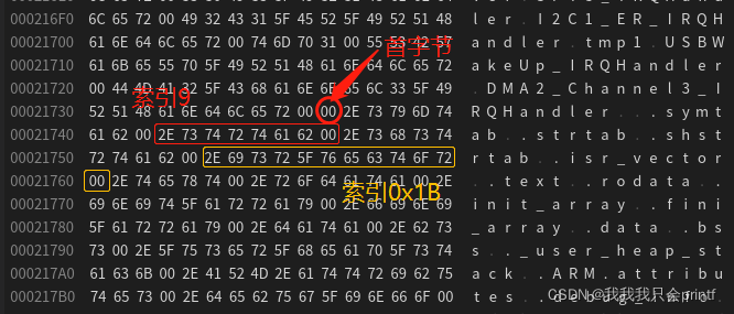 注意,字符串表的查表方式为从索引开始,到0x00结束的字符串内容。可以看到从第9个字节开始到0x00用字符串表示刚好是 .shstrtab ,而从第27个字节开始到0x00为止字符串内容刚好是 .isr_vector ,与预期相符。