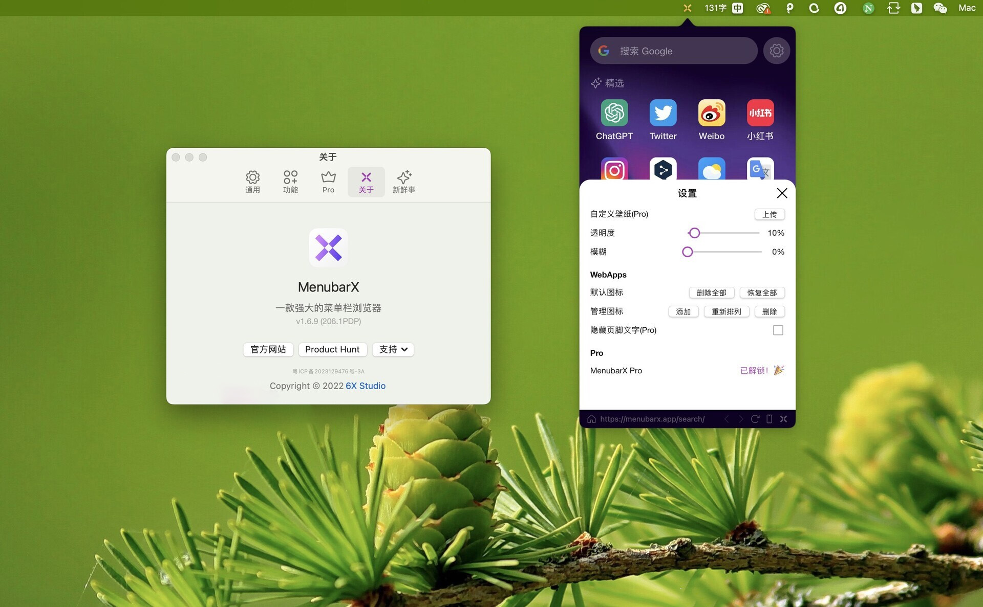 MenubarX Pro for Mac是一款专为Mac用户设计的菜单栏迷你小窗浏览器工具,它提供了一系列强大且实用的功能,使用户能够更高效地管理和控制他们的Mac设备。