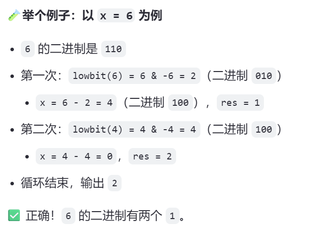 // 3.使用lowbit函数:每次减去x的最低位的1