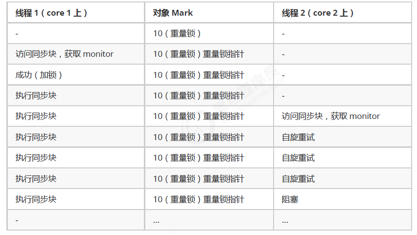 - 线程2进入自旋状态,不断检查对象的Mark字段,看锁是否已被释放。在这个过程中,线程2不会被阻塞,而是占用CPU时间进行循环检查。