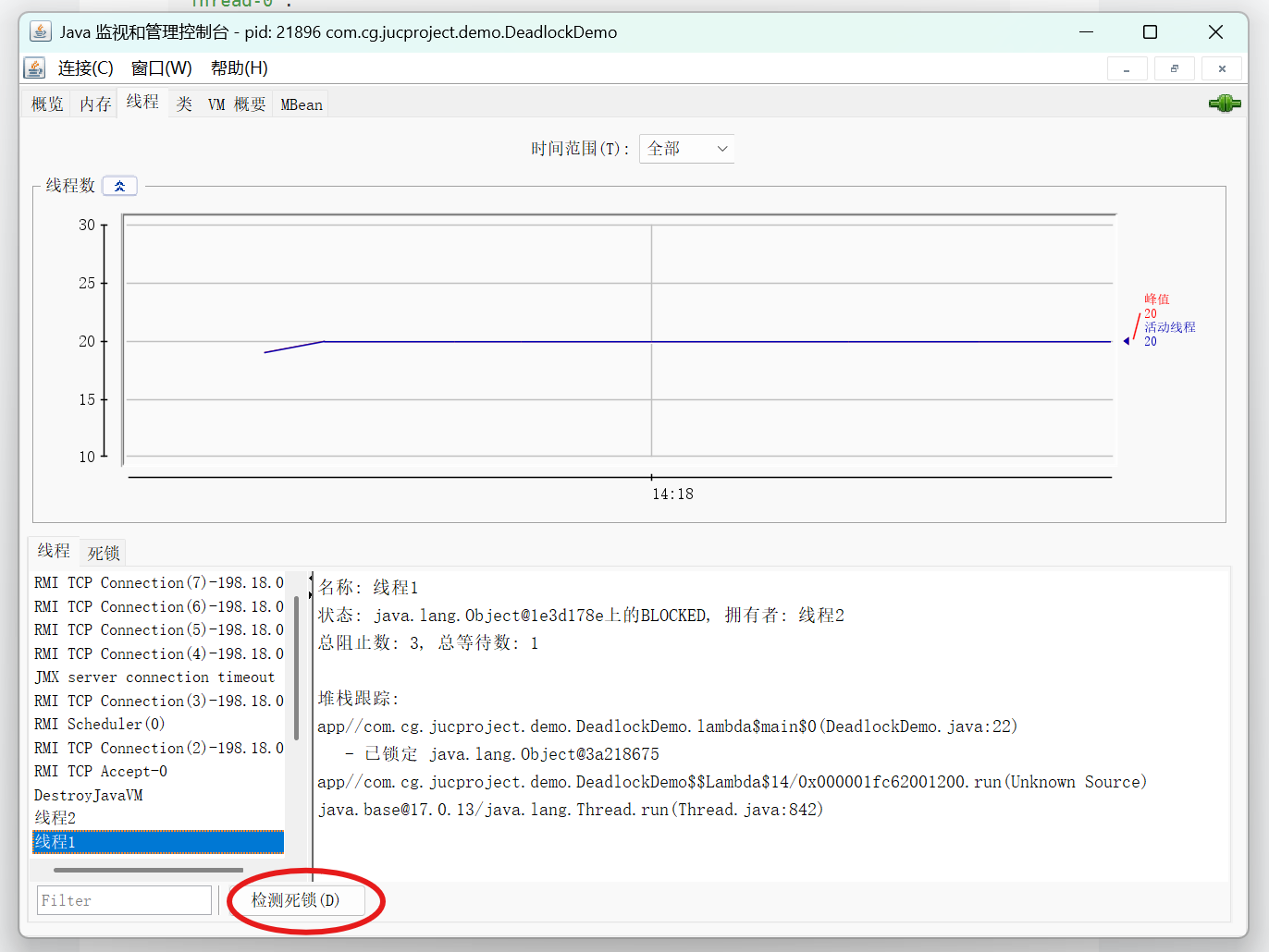 JDK 还自带一个可视化工具:jconsole,它会弹出一个图形界面,选择你的 Java 进程连接。然后点“线程”标签,再点“检测死锁”按钮。它会自动帮你找出死锁的线程,并高亮显示。
