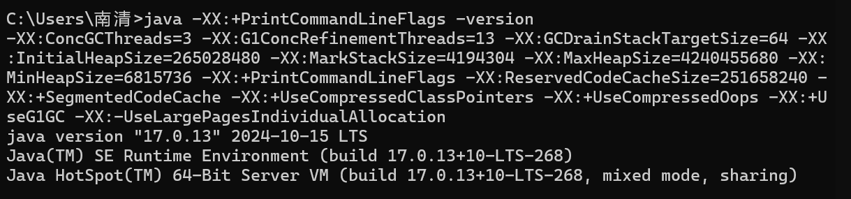 如果说收集算法是内存回收的方法论,那么垃圾收集器就是内存回收的具体实现。没有万能的垃圾收集器,我们能做的就是根据具体应用场景选择适合自己的垃圾收集器。可以通过 java -XX:+PrintCommandLineFlags -version 命令查看JDK 默认垃圾收集器: