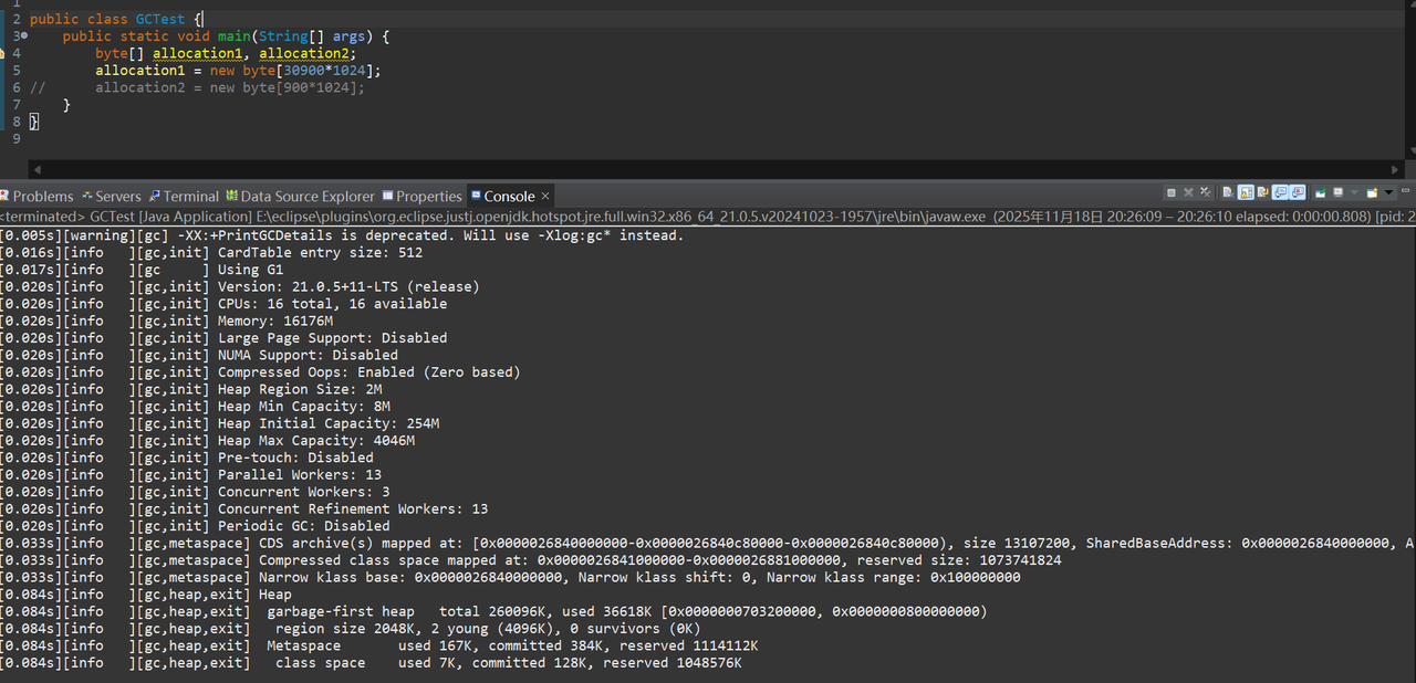 大多数情况下,对象在新生代中 Eden 区分配。当 Eden 区没有足够空间进行分配时,虚拟机将发起一次 Minor GC。运行添加的参数:-XX:+PrintGCDetails