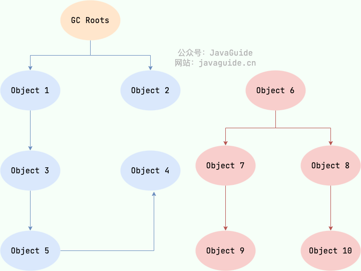 从 GC Roots 开始,像走关系网一样,能找到的对象就是“可达的”,是存活对象;找不到的就是“不可达的”,需要被回收。