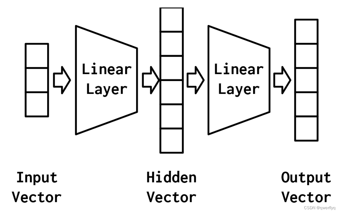 输入层:第一阶段是输入向量。这是给定给模型的向量。给定输入向量,第一个线性层计算一个隐藏向量——表示的第二阶段。隐藏向量之所以这样被调用,是因为它是位于输入和输出之间的层的输出。我们所说的“层的输出”是什么意思?理解这个的一种方法是隐藏向量中的值是组成该层的不同感知器的输出。