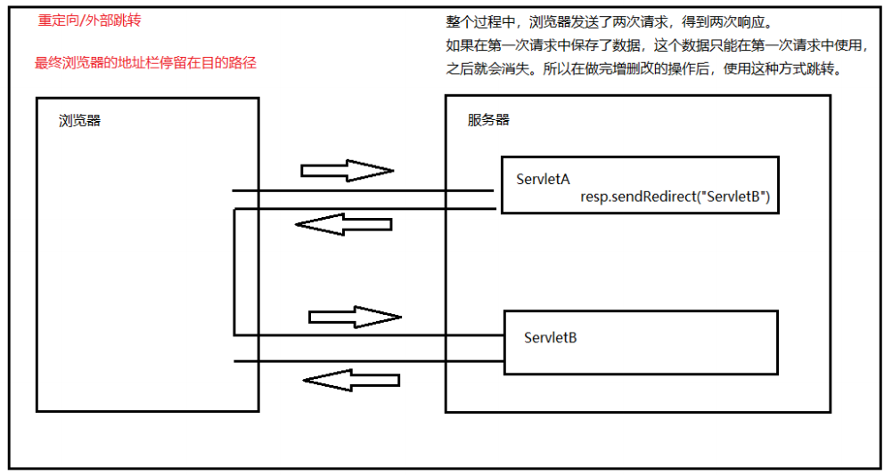 response.sendRedirect("跳转的地址");跳转到目的地时,浏览器的地址栏中的内容是最终的目的路径
