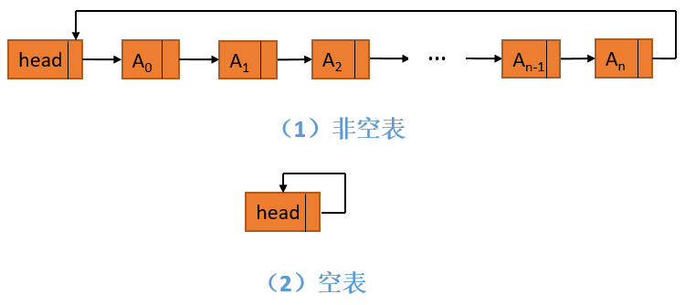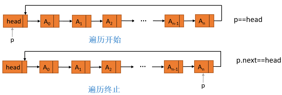 null。因此要输出链表元素时,其终止条件就不再是像非循环链表那样判断p==null或p.next==null,而是判别它们是否等于某一指定结点,如头结点head。如下图所示: