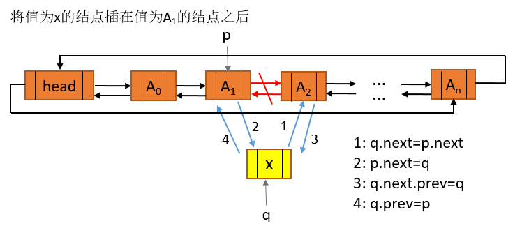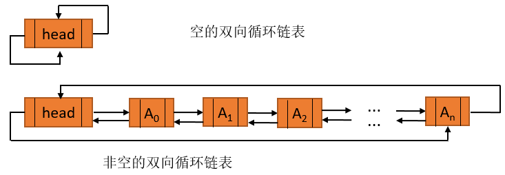 prev链接域指向结点的直接前驱,next链接域链接该结点的直接后继。双向循环链表图示