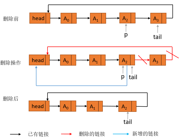 单循环链表的删除操作与普通的单链表操作基本类似,通过遍历找到要删除结点的直接前驱,然后改变前驱的链接情况。如下图: