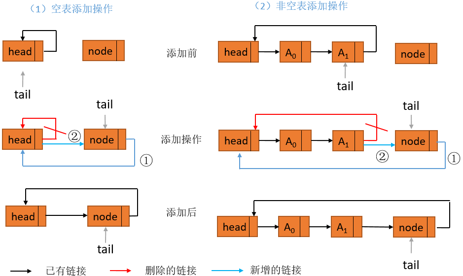 tail指向链表尾结点,因此添加结点node时只需改动tail和新结点node之间的链接关系即可。由于有头结点,所以空表和非空表的处理方式是一样的。