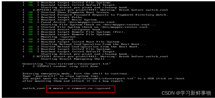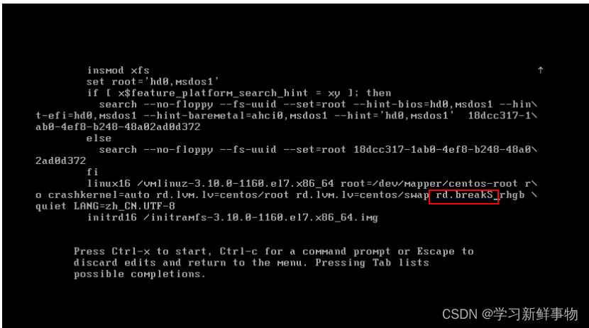 在linux16行中centos/swap后添加 rd.break参数(打断当前系统启动流程进入单用户模式)