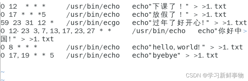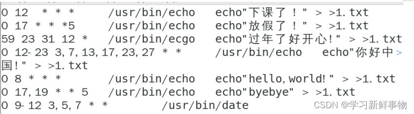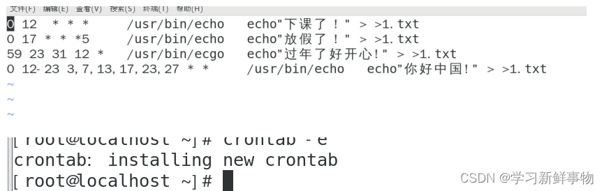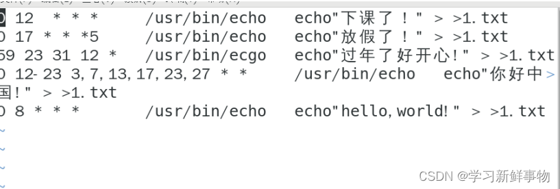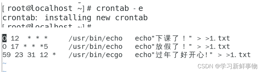 利用crontab命令设置每天12:00执行echo “下课了!”>>1.txt命令利用crontab命令设置每周5下午5:00执行echo “放假了!”>>1.txt命令