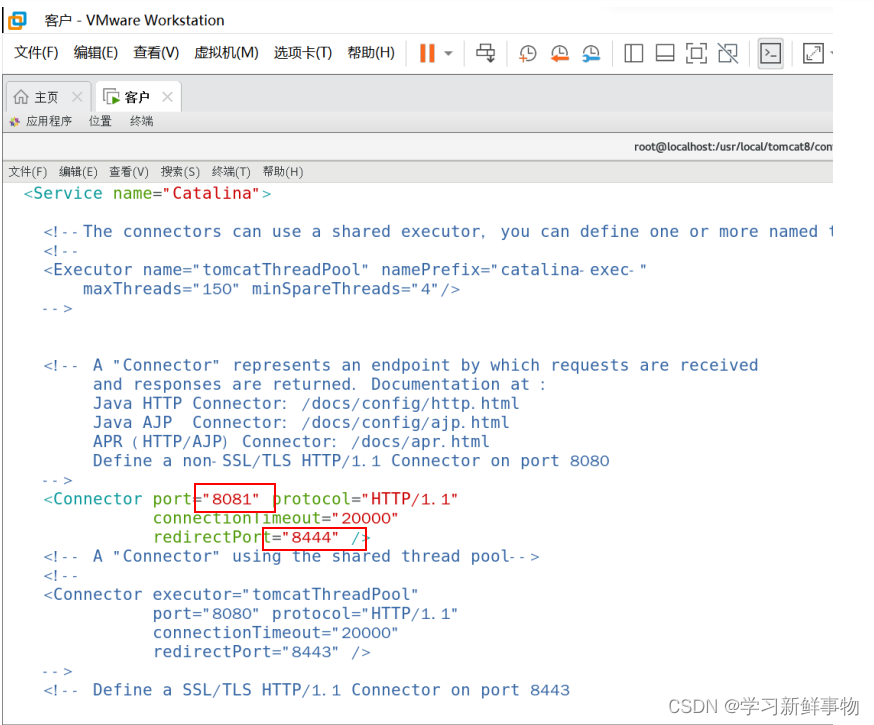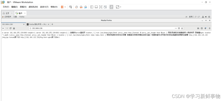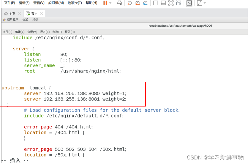 这段代码是Nginx的upstream配置,用于配置Tomcat服务器的负载均衡。其中,192.168.255.138:8080和192.168.255.138:8081是两个Tomcat服务器的地址和端口号。Nginx会将请求分配到这两个Tomcat服务器上,以实现负载均衡。