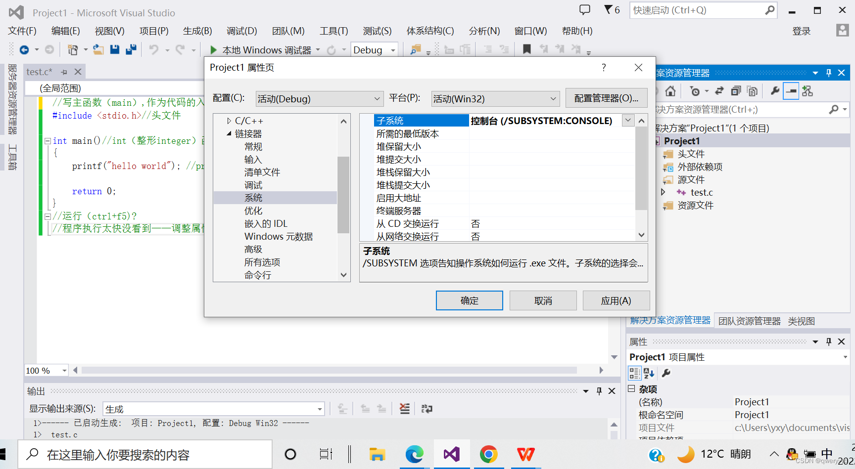 运行的快捷键则是CTRL+F5,而第一次运行时,程序只是闪现了一下,根据课程指引,我知道需要在项目属性里将链接器的子系统改为控制台,这样程序就能持续地运行。