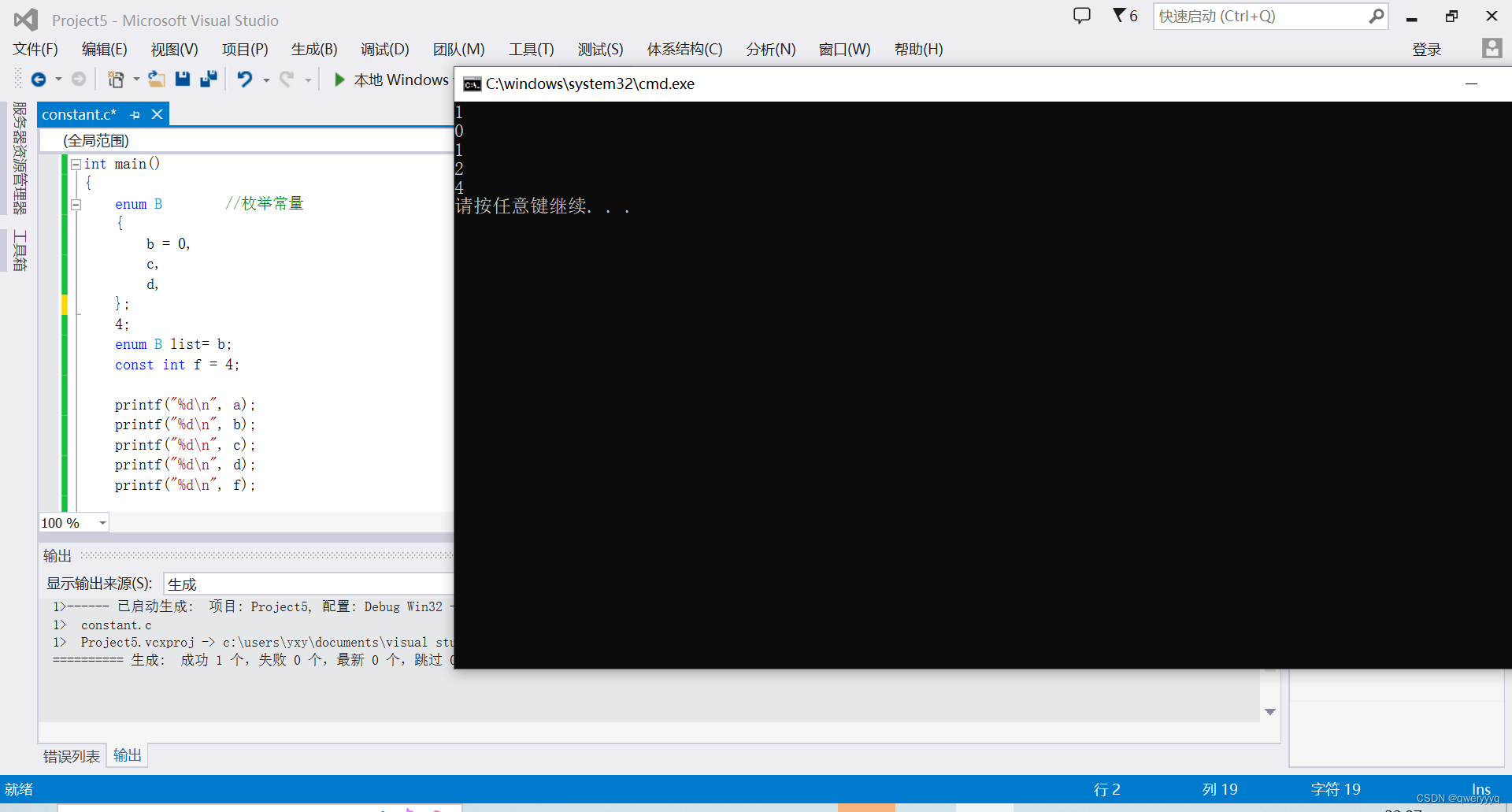 3是枚举常量,也就是enum 名称{}定义的一串常量,其中的常量赋初值以后都是不可改变的,enum放置的位置也是不受限制的。这些常量便是被定义的名称在整个程序中可能出现的所有情况,同时默认逐一增长,如图中的bcd对应的012