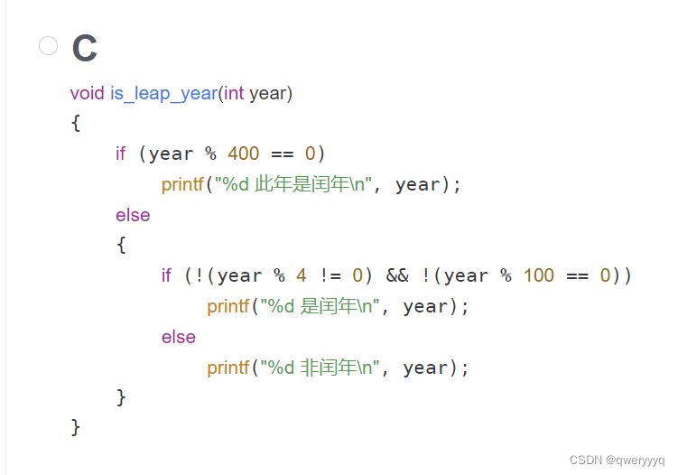 对于A程序,通过取模判断整除性,可以正确判断出闰年,而这里的&&操作符只有在两边都不能满足时才取0,而这里只要需要满足其中一个就算是闰年,只有当前者为0,后者为0,才不是闰年,所以判断正确。