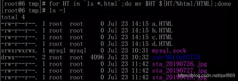 [root@6 tmp]# for HT in `ls *.html`;do mv $HT ${HT/%html/HTML};done