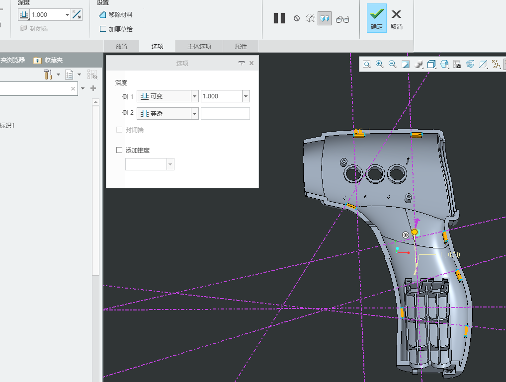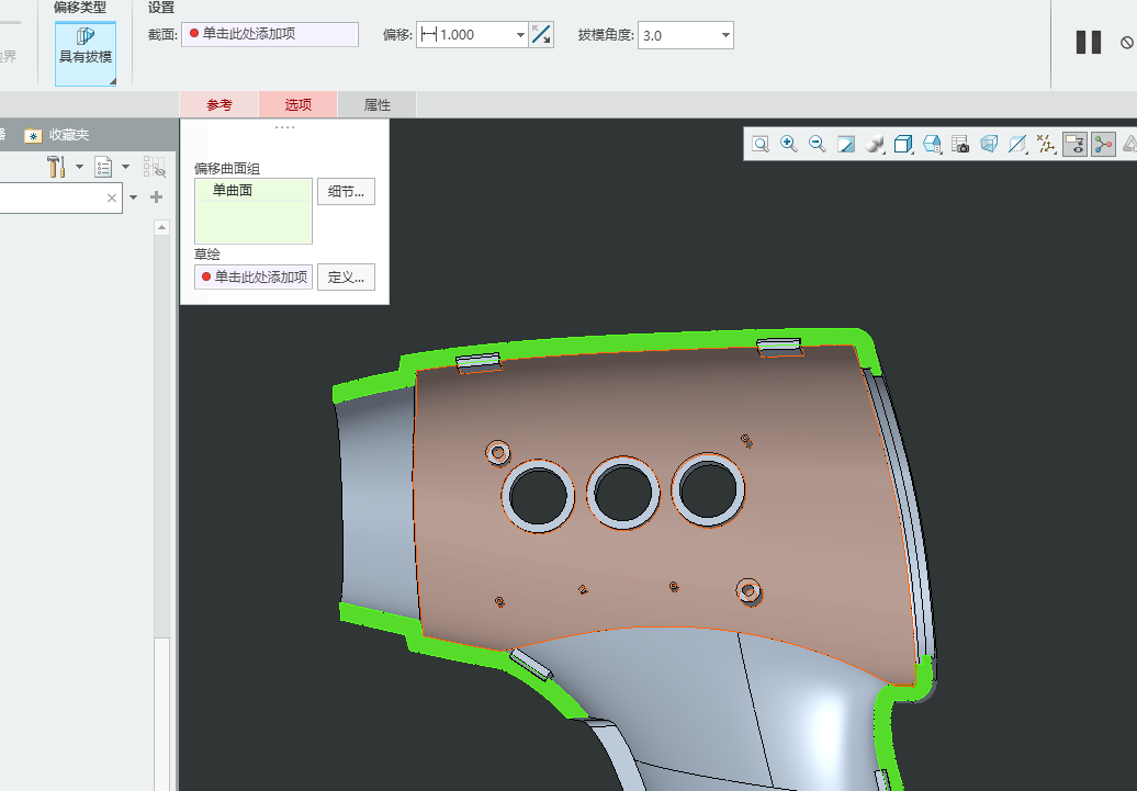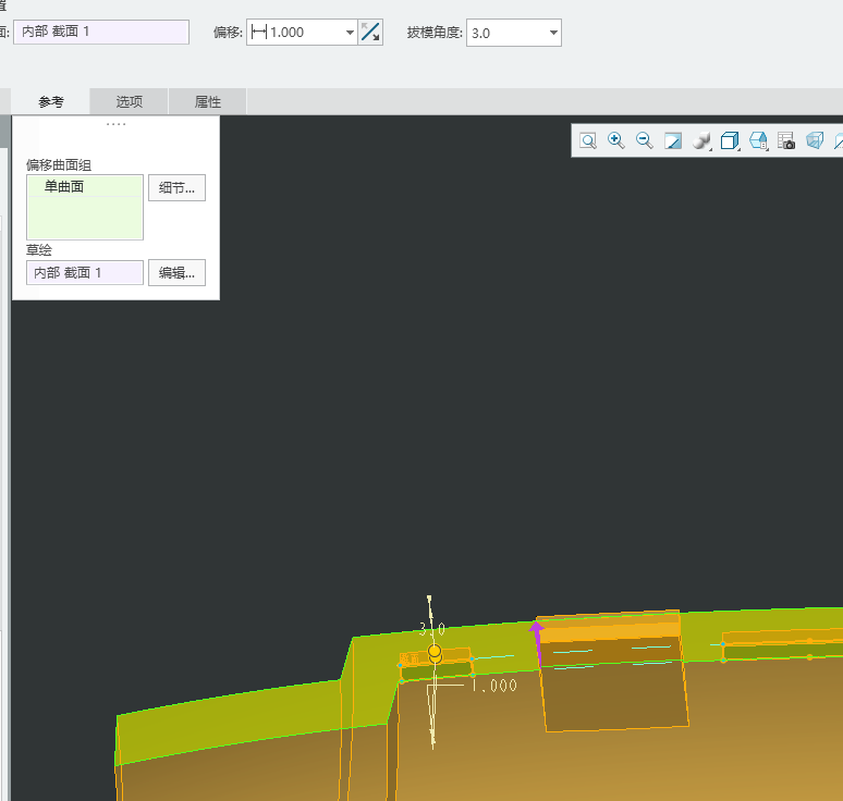 1、画图思路 卡扣画法 在上盖拉伸公扣骨位,草绘斜矩形,长6mm,宽1mm,拉伸向上1mm,向下穿透 在骨位上拉伸扣位,长6,宽1.5,高1 拉伸卡扣 倒斜角0.5mm 画止口,长6.0,宽1.6,高1.5 止口画法 以上盖平面做基准平面,选择 偏移-具有拔模特征 草绘止口,止口宽度0.8,高度1.0,步骤偏移0.8,投影边 偏移1.0,拔模3度