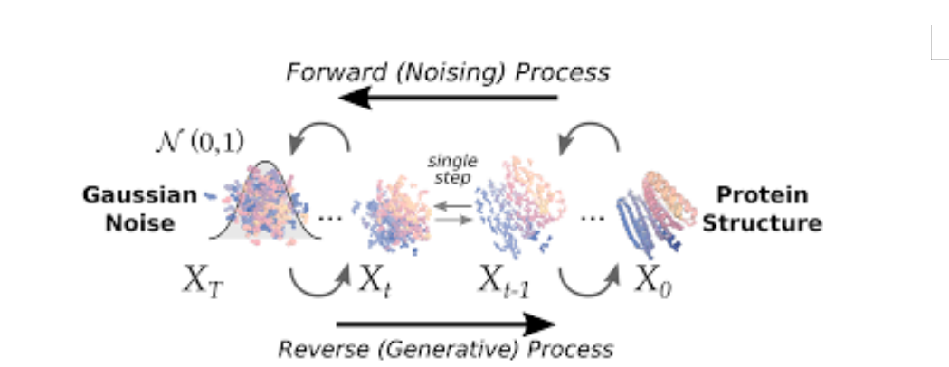 - 扩散模型 (Diffusion Model):详细阐述扩散模型的前向加噪(Forward Process)与反向去噪(Reverse Process)的数学原理 。重点讲解该模型如何被应用于RFdiffusion,实现从高斯噪声中逐步生成结构合理的蛋白质骨架