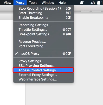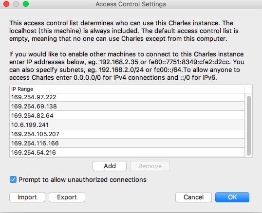 如果不小心点击了拒绝,可以手动添加手机IP/Mac地址到允许访问列表,或者重启Charles,手机再次访问,会再次提示选择。