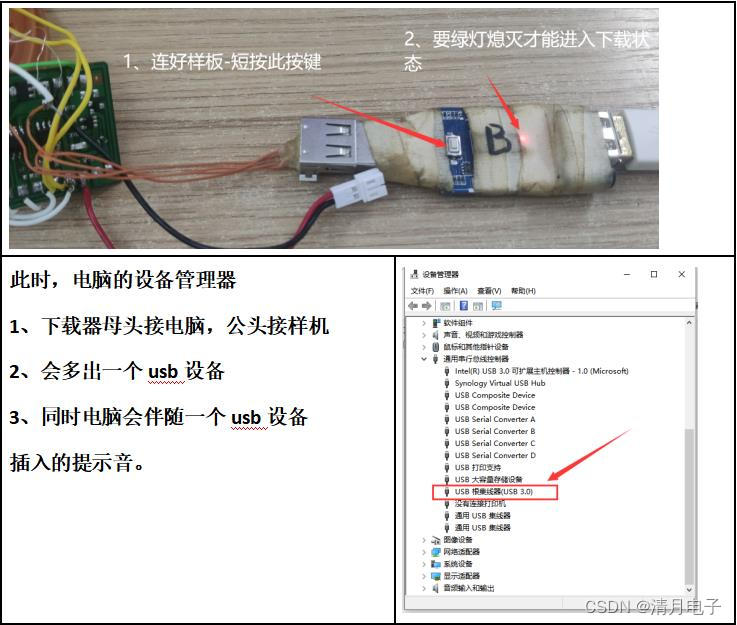 如果是更新蓝牙芯片的程序,建议使用V2.0的工具,更好用.不需要按按键,直接插进去就能自动进入下载如:
